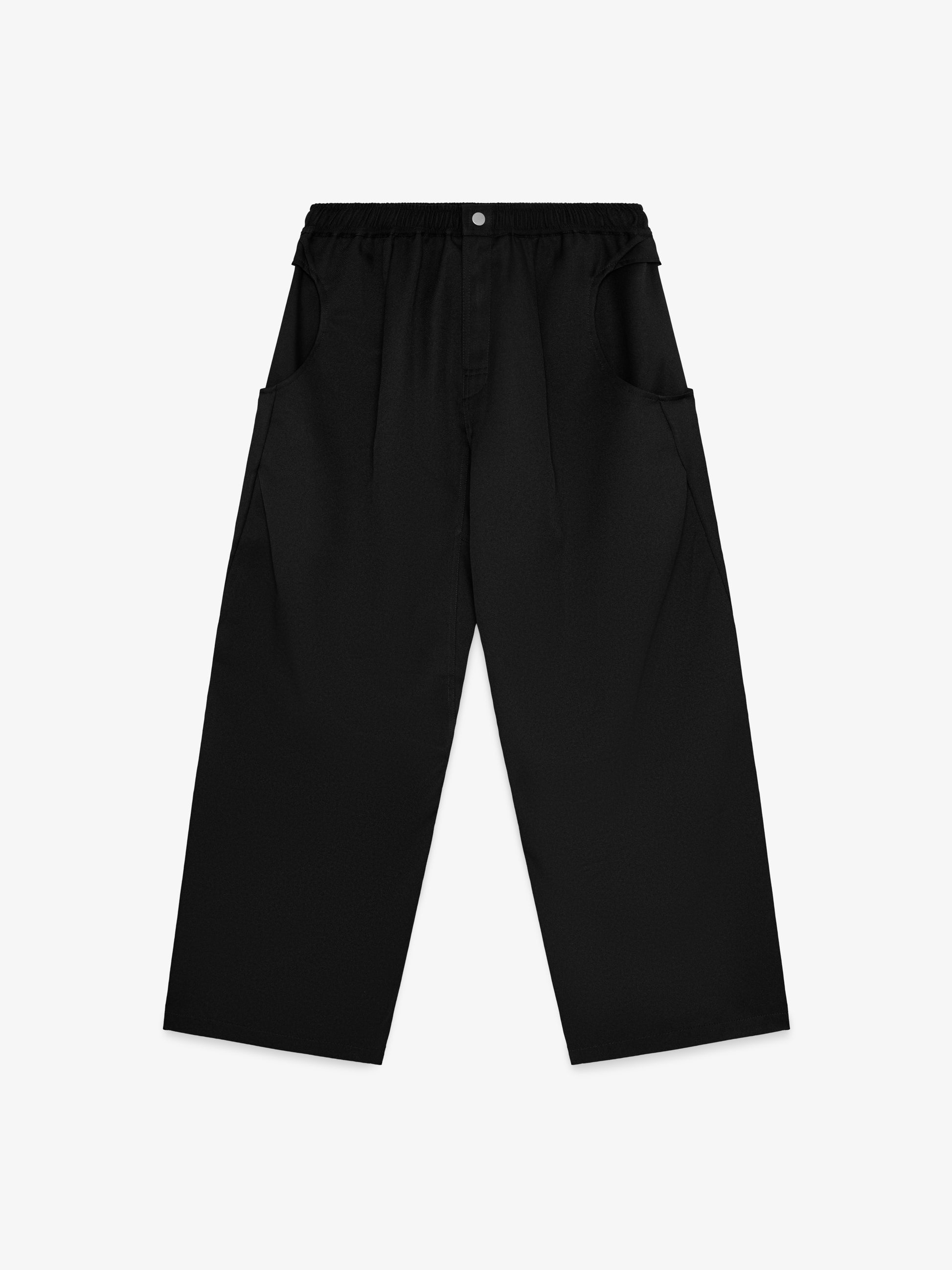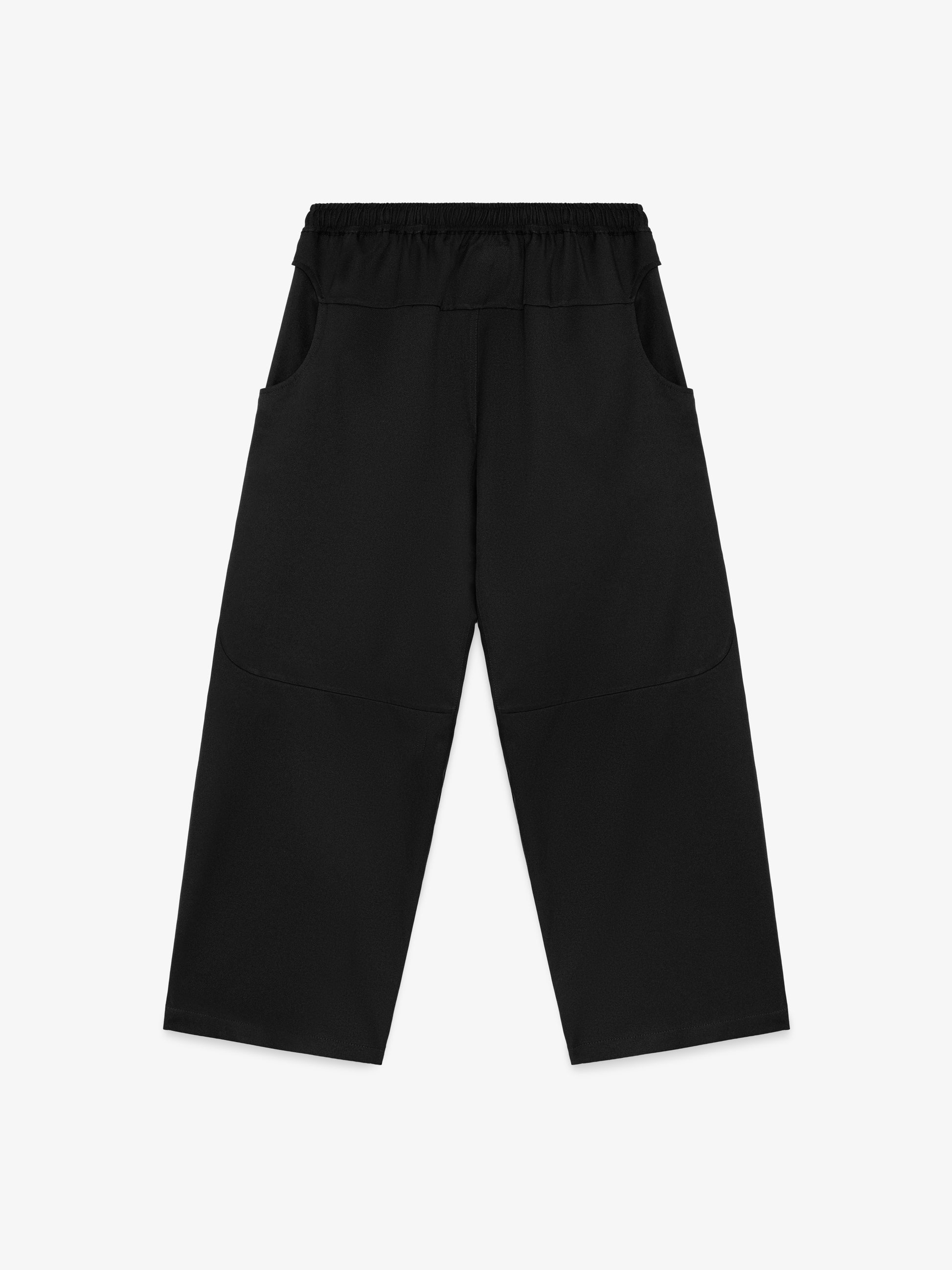 Wide leg pant with articulated knee and pleats for enhanced shaping. Features an elasticated waistband with internal drawcord, snap closure, and signature circle hand pockets.