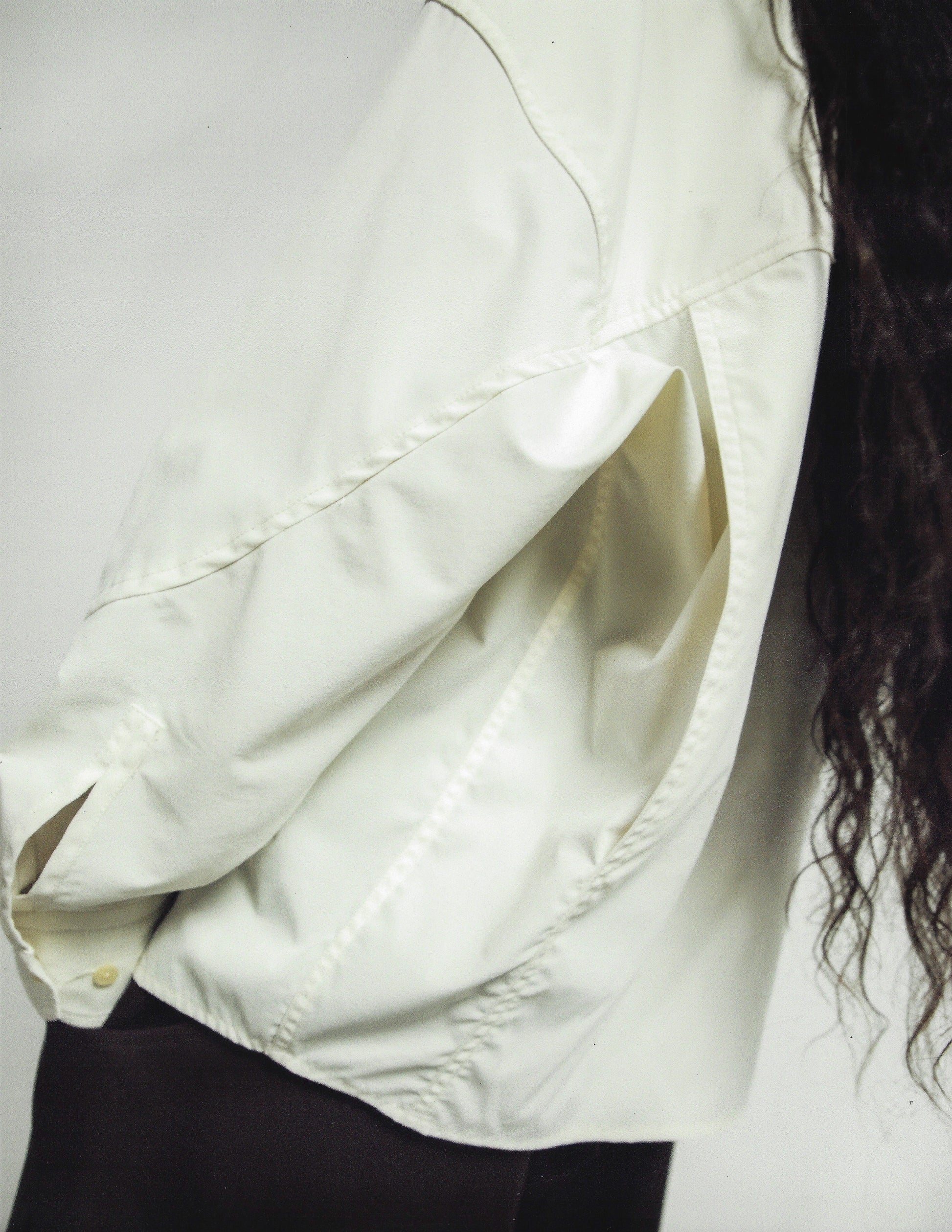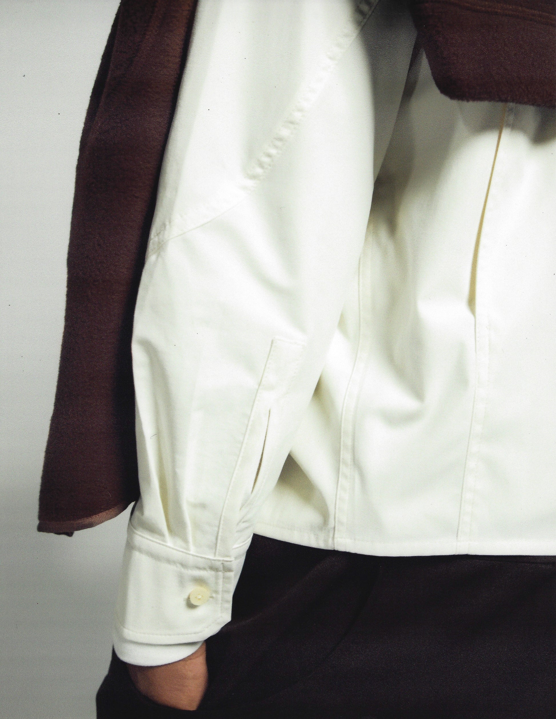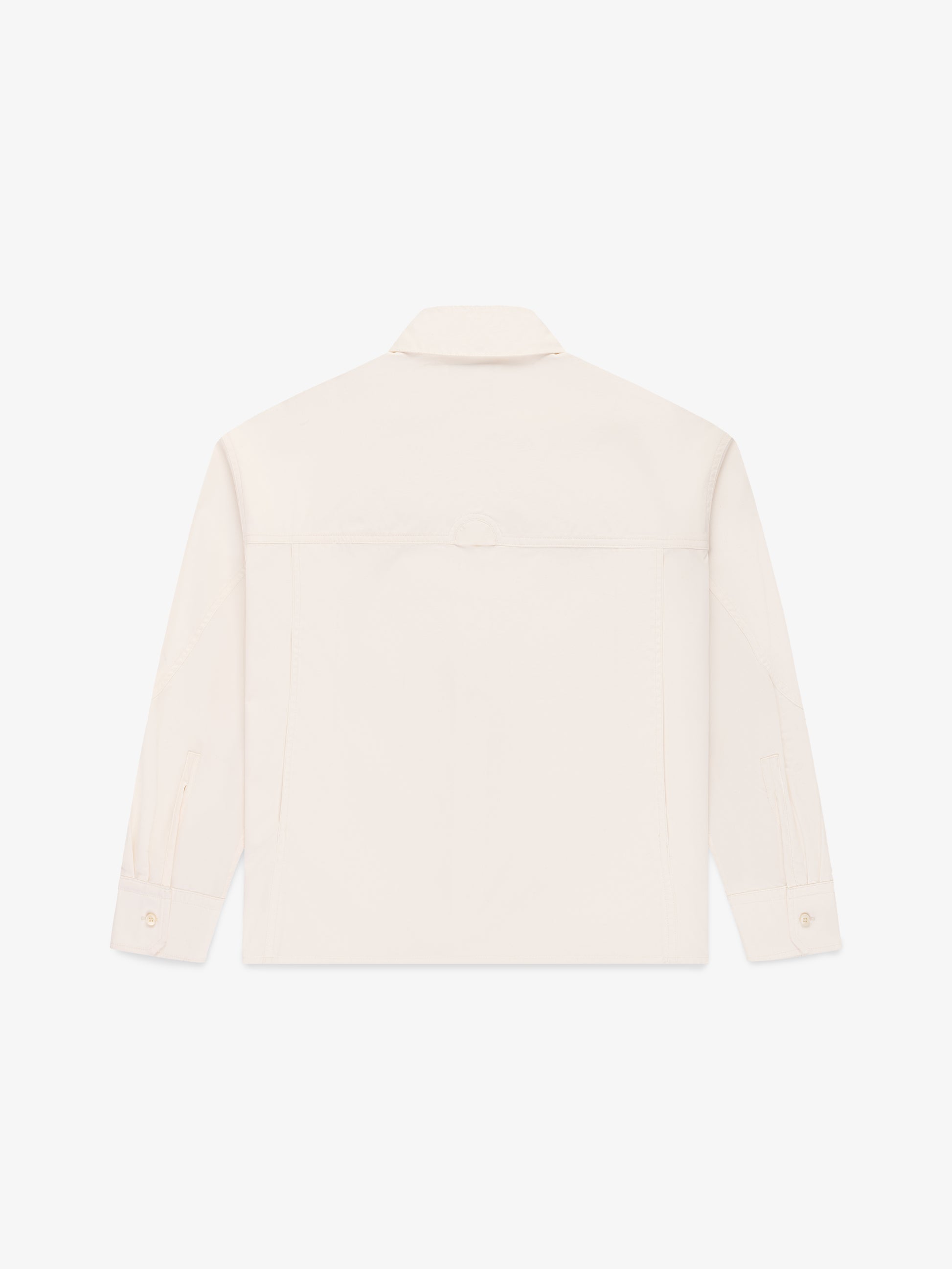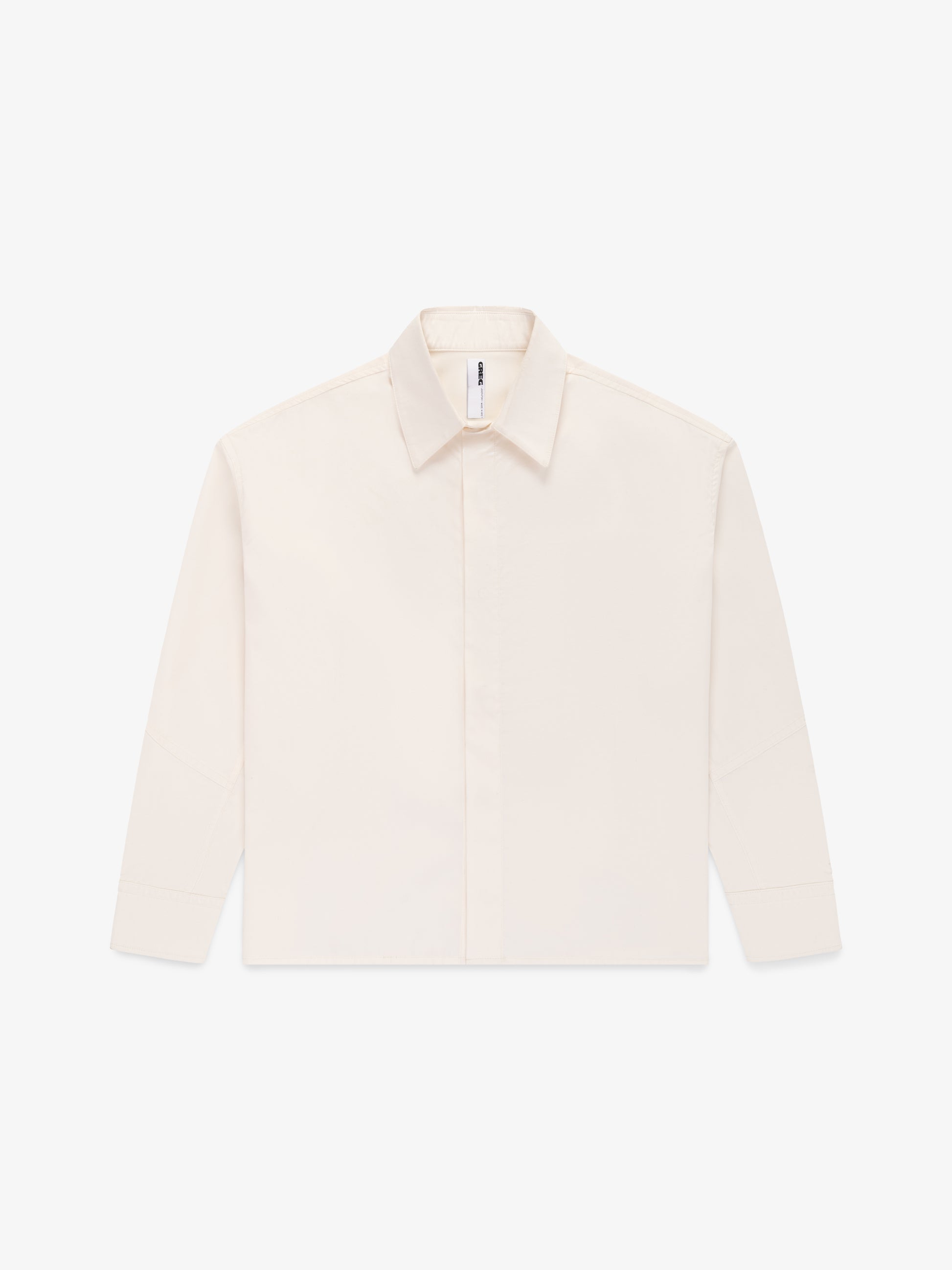 Boxy cropped shirt in stretchable poly conjugated fiber weather cloth with water-repellent protection. This garment features rubberized buttons, a hidden placket, dart construction at the cuffs, and the signature locker loop detail.